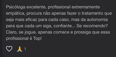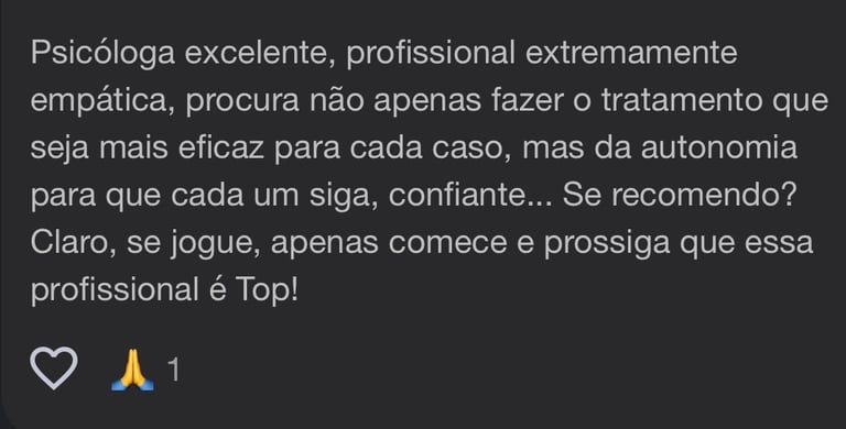 Cada Ser Humano é único, portanto, acredito que nenhuma pessoa pode ser encaixada em uma única abordagem, em uma única teoria. No meu atendimento eu levo em consideração a narrativa histórica de cada indivíduo e o progresso terapêutico desenrola-se a partir das necessidades de cada cliente.